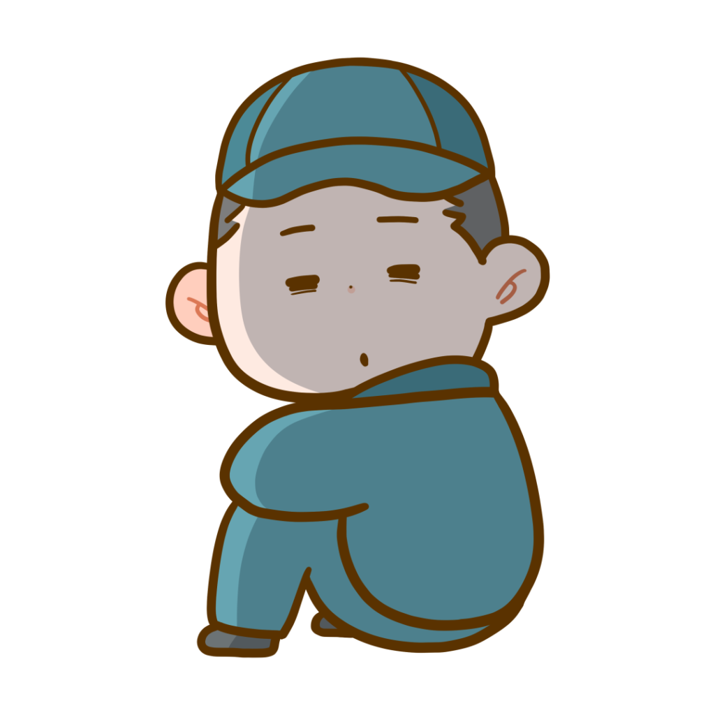 作業服を着た工場で働く人(作業員) 体育座りで落ち込んでいる様子のフリーイラストです。