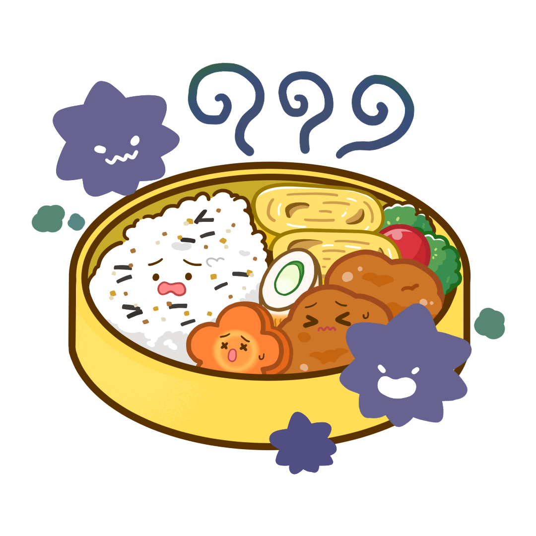 食中毒の原因になりそうな痛んだ(腐った)お弁当のかわいいフリーイラストです。